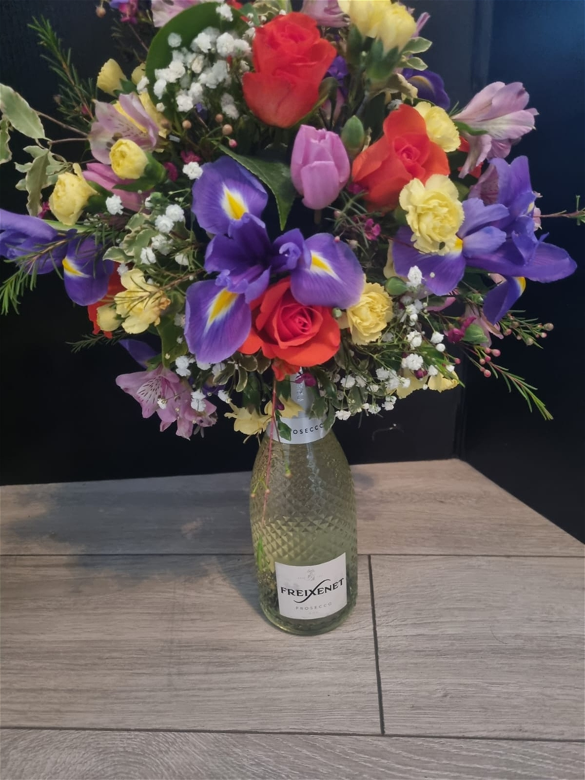 A unique and eye-catching floral arrangement designed in a decorative Prosecco bottle. This arrangement is created using a beautiful selection of fresh seasonal flowers and foliage in a vibrant colour palette, carefully arranged to create a full and elegant display.